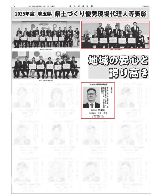 埼玉建設新聞に県土づくり優秀現場代理人等表彰の記事が掲載されました